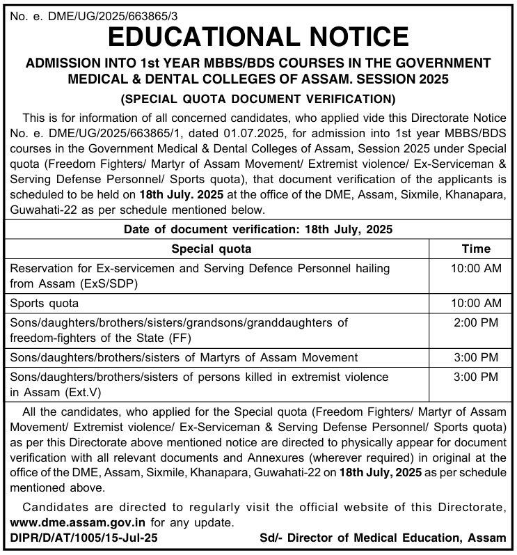 DME Assam has issued a Notice regarding the document verification process for candidates applying under special quotas for admission into 1st year MBBS/BDS courses in the Government Medical and Dental Colleges of Assam for the Session 2025. As per the notification, document verification for candidates applying under various special quota categories will be held on 18 July 2025 at the office of the DME, Assam, located in Sixmile, Khanapara, Guwahati-22.