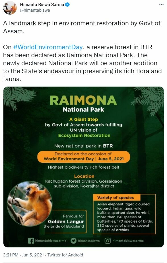 “A landmark step in environment restoration by Govt of Assam. On #WorldEnivonmentDay, a reserve forest in BTR has been declared as Raimona National Park. The newly declared National Park will be another addition to the state’s endeavour in preserving its rich flora and fauna.”
