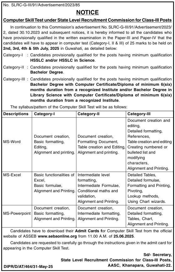 The State Level Recruitment Commissions (SLRC) for Class III Posts will conduct the Computer Skill Test on 2, 3, 4, 5 July 2025 in Guwahati. Admit cards will be available for download from 25 June 2025 through the official portal, www.sebaonline.org.