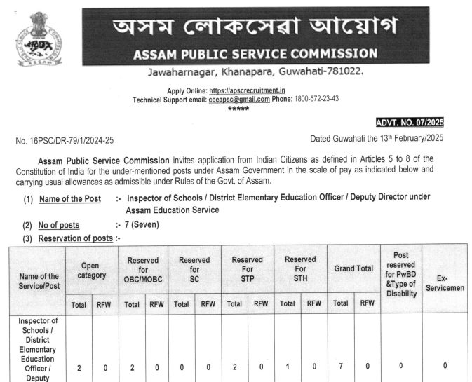 Through this APSC Notification 2025, the Assam Public Service Commission has invited applications for a total of 07 vacancies for various posts. Candidates who are eligible for the recruitment and willing to work as Inspector of Schools, DEEO, and Deputy Director can apply.