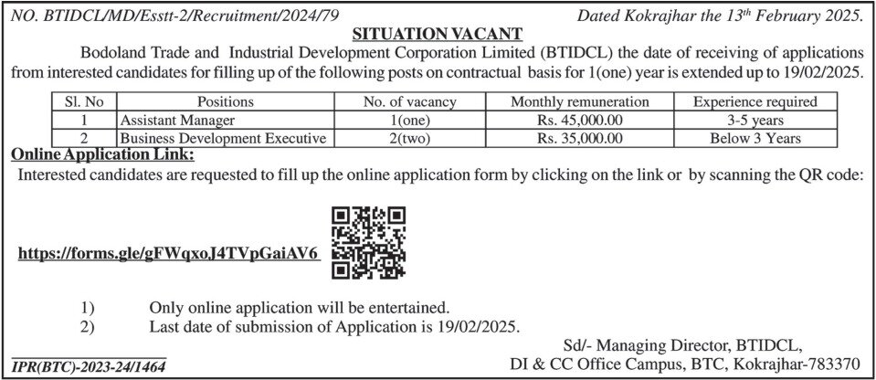 Interested candidates fulfilling the eligible norms for Bodoland Trade and Industrial Development Co. Ltd. Recruitment 2025 are request to fill up the online application form by clicking on the link or by scanning the QR code.