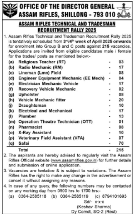 Assam Rifles Technical and Tradesman Recruitment 2025 Notification has been released for various Group B and Group C posts. The Assam Rifles Technical and Tradesman Recruitment Rally 2025 is tentatively scheduled d from 3rd / 4th week of April 2025 onwards. A total of 215 vacancies are available for various trades.