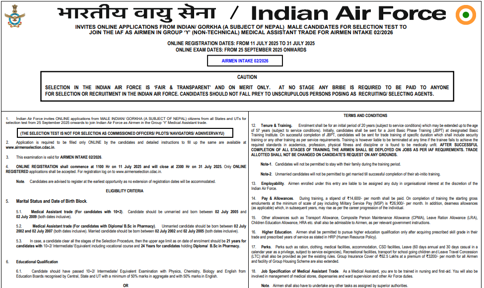 Indian Air Force Airmen Recruitment 2025: The Indian Air Force (IAF) has invited online applications for recruitment to the post of Airmen in Group ‘Y’ (Non-Technical) Medical Assistant Trade under Intake 02/2026. Eligible unmarried male candidates who are Indian citizens or Gorkhas (subjects of Nepal) can apply online from 11 July to 31 July 2025.