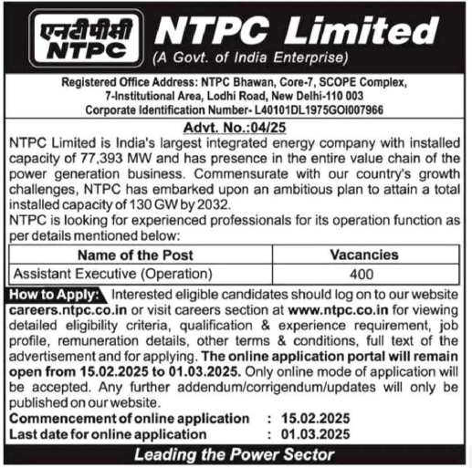NTPC Assistant Executive Recruitment 2025: The National Thermal Power Corporation Ltd (NTPC) is recruiting 400 posts of Assistant Executive (Operations). Interested candidates can apply online from 15 February 2025 to 01 March 2025 using given link below.