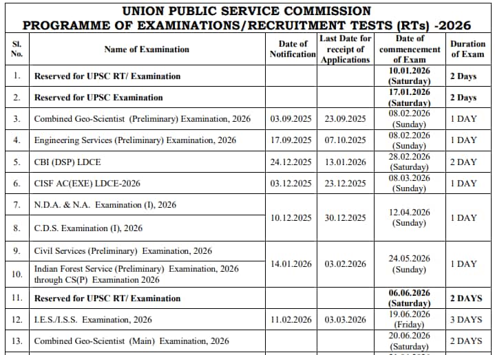9. | Civil Services (Preliminary) Examination, 2026 | 14.01.2026 | 03.02.2026 | 24.05.2026 (Sunday) | 1 DAY |