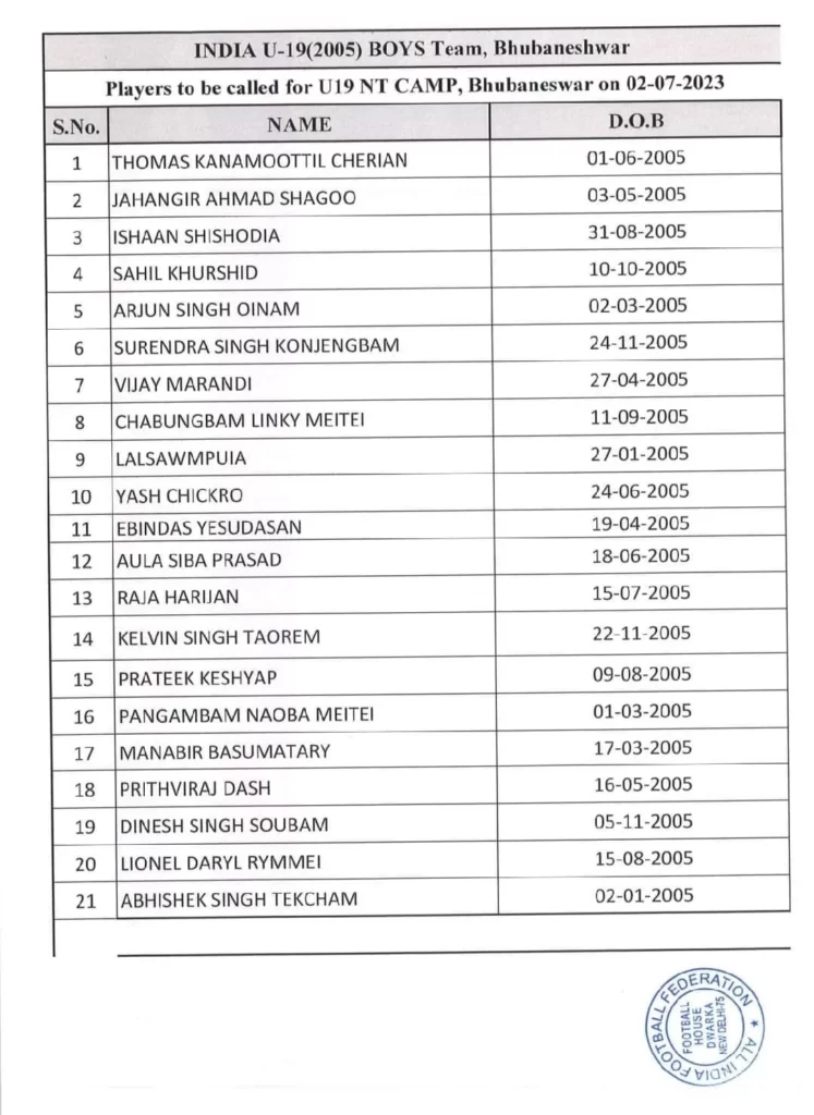 The list of selected players to be called for U 19 NT Camp along with Manabir Basumatary has been shared below: