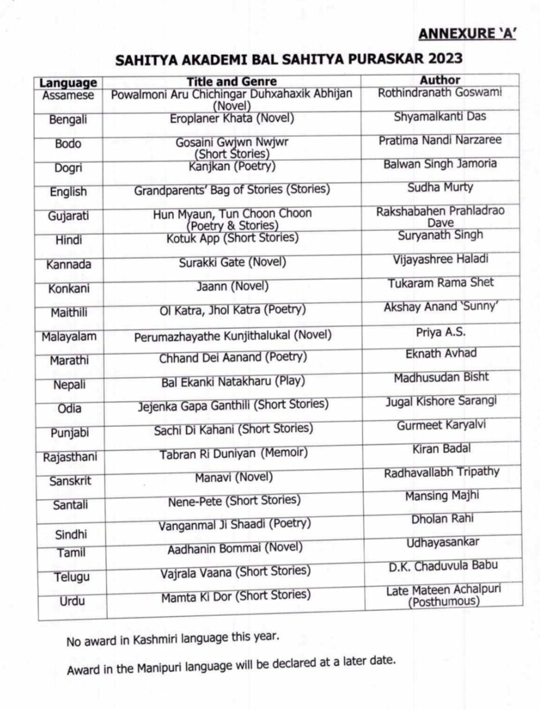 | Sahitya Akademi Bal Puraskar Award 2023 Lis PDF | Download Here |