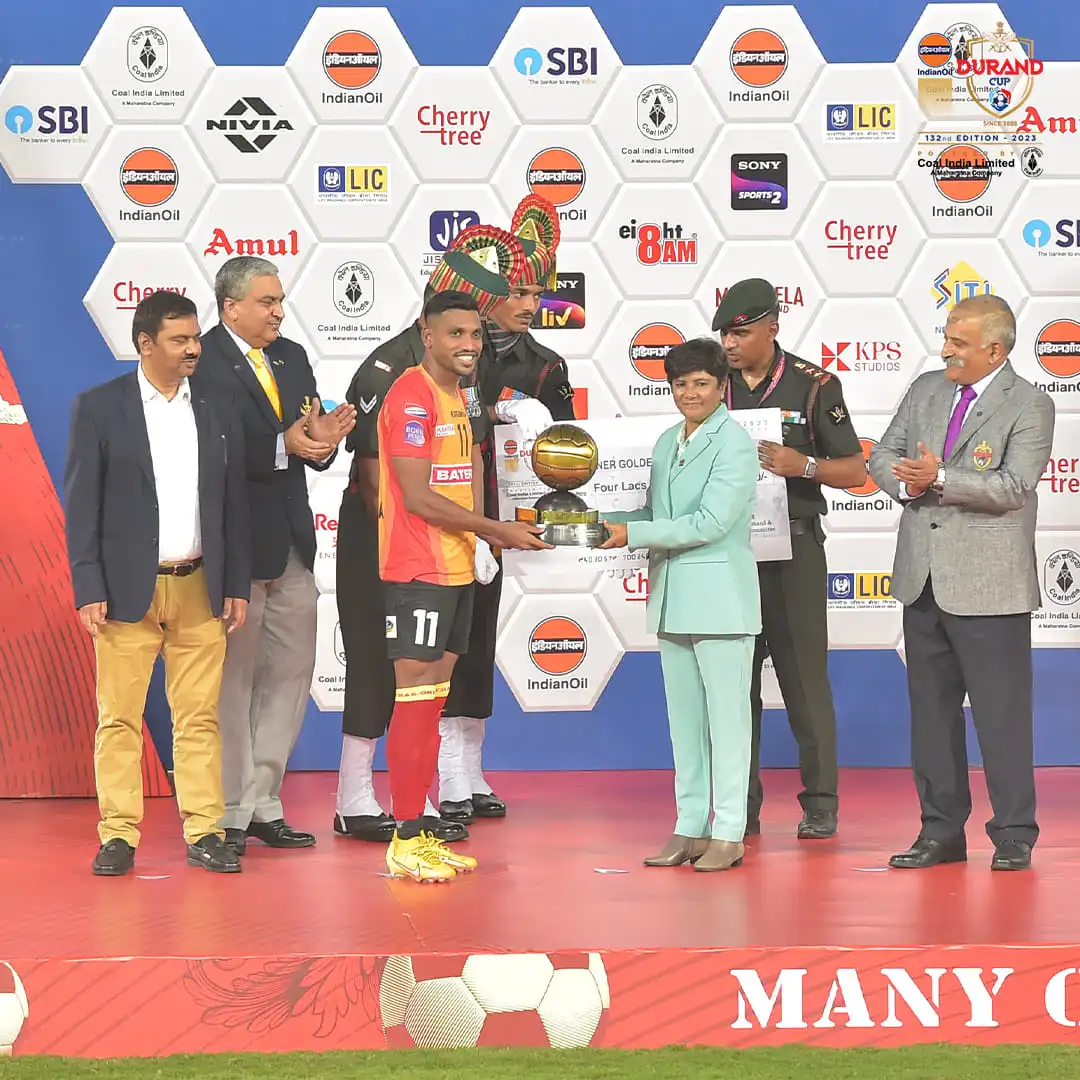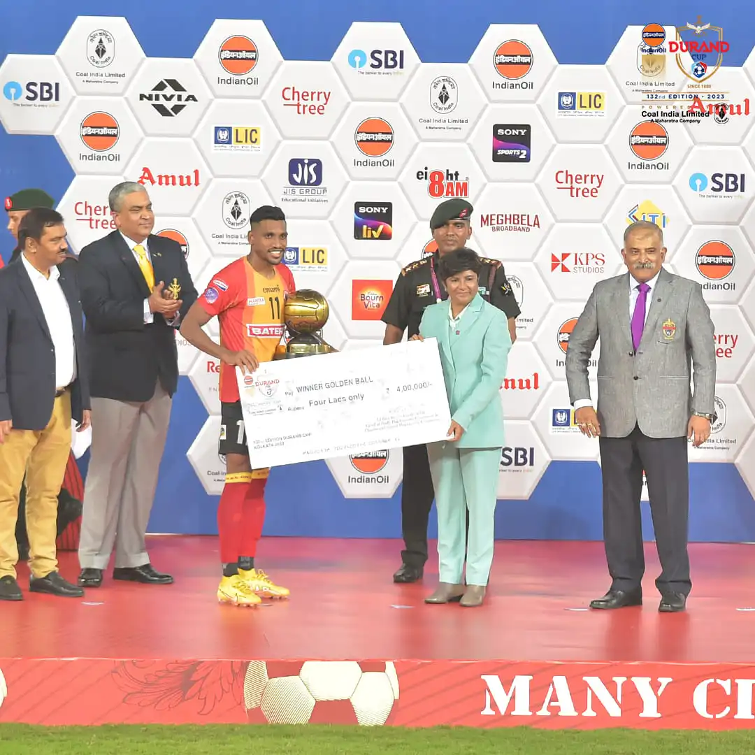 Nandhakumar Sekar from Emami East Bengal FC was celebrated as the Golden Ball Winner for his exceptional performance throughout the tournament. He received the Golden Ball trophy and a 4-lakh rupee cash prize from Ms. Sukla Mistry, Director of Refineries IOCL.