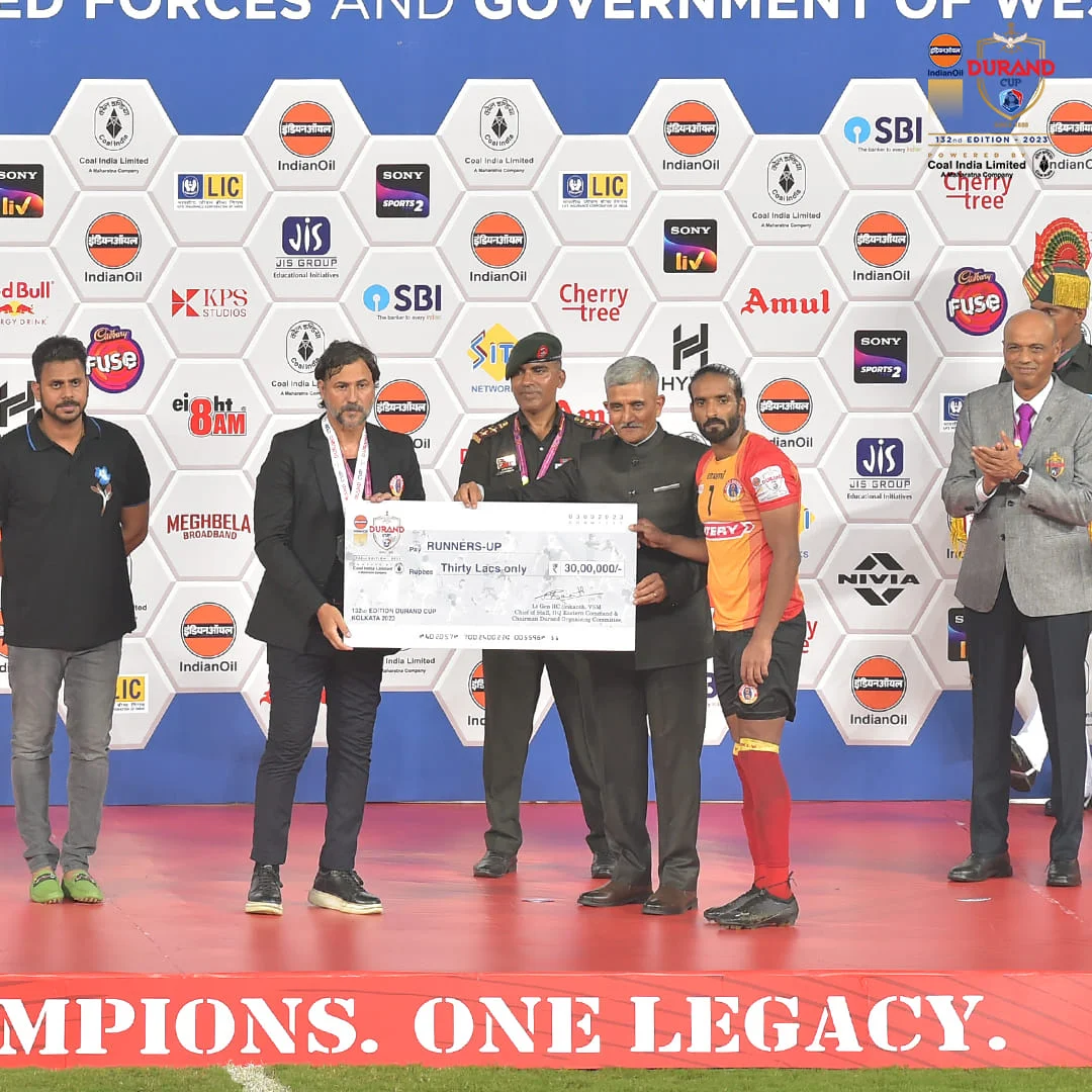 Durand Cup 2023 Runners-Up: Emami East Bengal FC, the runners-up, received silver medals and a 30-lakh rupee prize from Air Marshal Sujeet Pushpakar Dharkar, AOC-in-C, EAC.