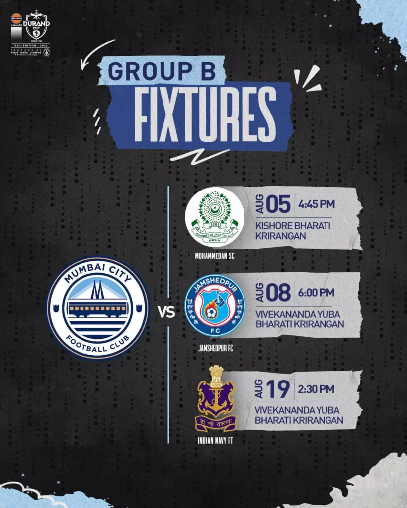 Mumbai City FC will be participating in the upcoming Durand Cup 2023, specifically in Group B matches. The matches in this group will be held in Kolkata, where Mumbai City FC will compete against three other participating clubs- Mohammedan SC, Jamshedpur FC and Indian Navy football team.
